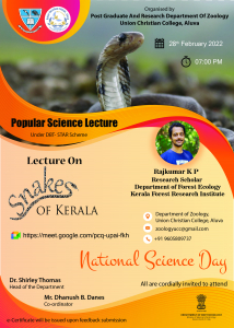 Popular Science Lecture in connection with National Science Day on the topic "SNAKES OF KERALA" ? ?️ 28/02/2022 (Monday) ?️ 07.00 P.M. onwards Resource person: Rajkumar K P Research Scholar,…